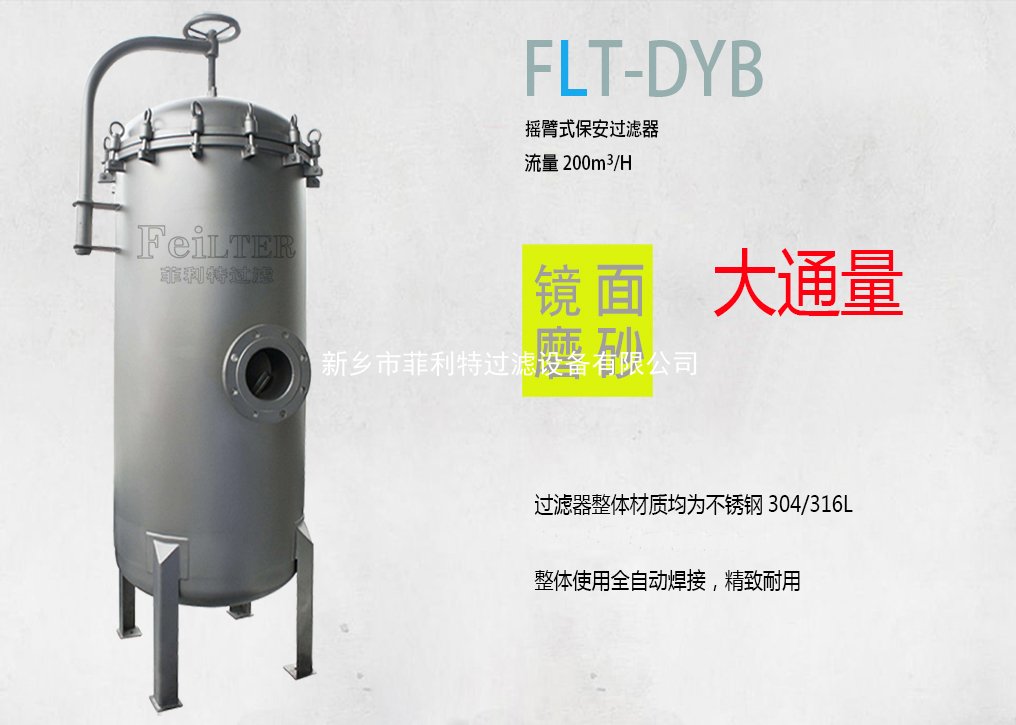 法蘭式搖臂保安過濾器是直徑Φ 500以上的,或30芯以上的精密過濾器封頭比較大,一個人提不動過濾器封頭,在更換濾芯時為了拆卸封頭方便,使用搖臂,只要將搖臂把封頭移開,不用拆卸,這樣更換濾芯時就快捷方便了很多。