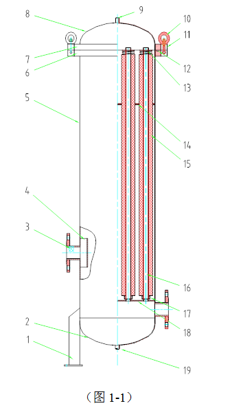 1-支腳 2-下封頭 3-進(jìn)水口 4-檔水板 5-桶體 6-快裝下法蘭 7-快裝上法蘭 8-上封頭 9-壓力表口 10-吊母 11-吊片 12-密封圈