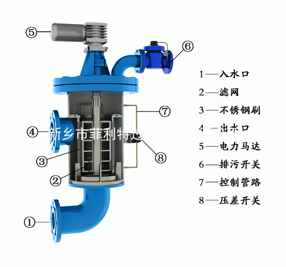 原水從進水口流入,進入過濾器濾筒內部,然后自內而外的通過濾桶,雜質被攔截在過濾筒內壁,過濾后的干凈水從出水口流出,當濾筒內壁的雜質越積越多,在濾筒內表面形成濾餅,并使濾筒內外逐漸形成壓差,當壓差達到壓差控制器預設值時,將啟動自清洗過程。過濾器的自清洗過程是依靠沿著濾筒內表面做旋轉運動的清洗刷和排污閥共同完成,打開的排污閥使被堵塞的濾筒內形成負壓,附著在濾筒內壁的濾餅被清洗刷清掃下來因負壓的關系經排污閥排出在本體外。整個清洗過程大約為60秒,清洗時系統(tǒng)不斷流。